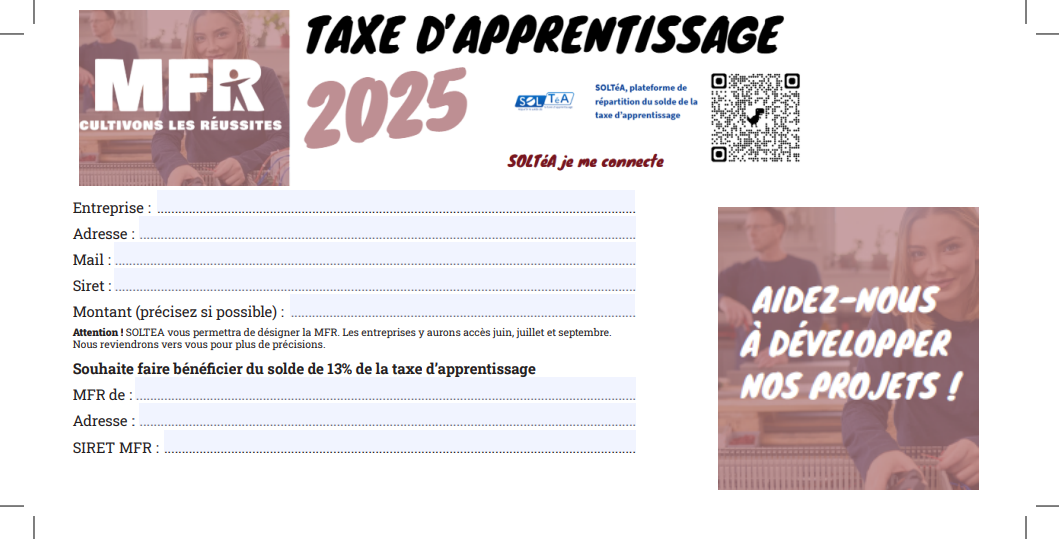 Nos trois cycles de formation par alternance valorisent l’apprentissage des jeunes en milieu professionnel, l’immersion en entreprise est réellement une valeur ajoutée pour acquérir des compétences dans l’exercice des métiers du service à la personne, du sanitaire et social, petite enfance et de la vente. A partir de 14 ans, les jeunes peuvent intégrer notre cycle d’orientation professionnelle qui leur permet de réaliser des stages dans des entreprises de différents secteurs professionnels. Ils peuvent alors cibler la formation qui leur correspond le mieux. Vous souhaitez participer à nos côtés à la formation professionnelle des jeunes, choisissez notre MFR comme établissement partenaire pour verser votre contribution de la taxe d’apprentissage 2025 (solde 13%). Les entreprises doivent s’acquitter du versement de la taxe 2025 avant le 31 juillet 2025. Vous portez votre choix vers notre établissement, connectez-vous à la plateforme SoltéA. Comment désigner la MFR de ROUTOT : Compléter ce document que vous nous renvoyez à la MFR Désigner la MFR sur la nouvelle plateforme SoltéA : www.soltea.education.gouv.fr/espace-public/connexion-lespace-prive via net entreprise Si c'est votre cabinet comptable qui fait la désignation de la MFR, pensez à préciser le Siret de la MFR de ROUTOT: SIRET : 78 083 909 8000 16 UAI : 0271400A |